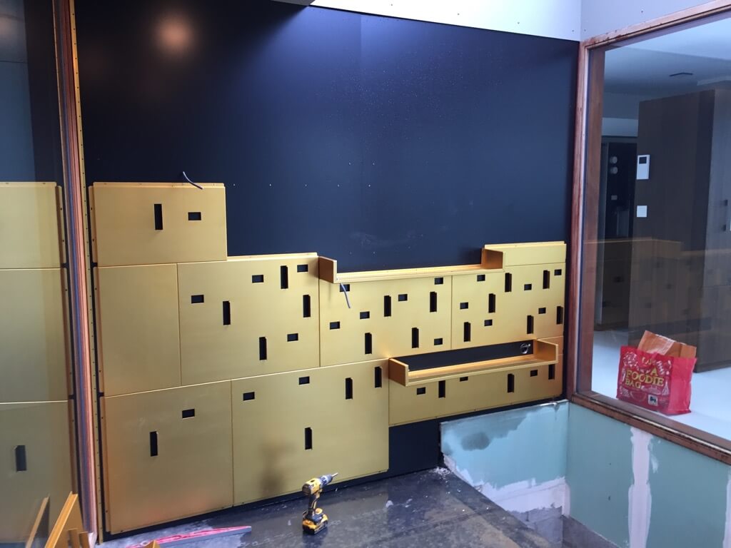 Muret décoratif en cours de construction en aluminium anodisé couleur "or" à Louveigné.